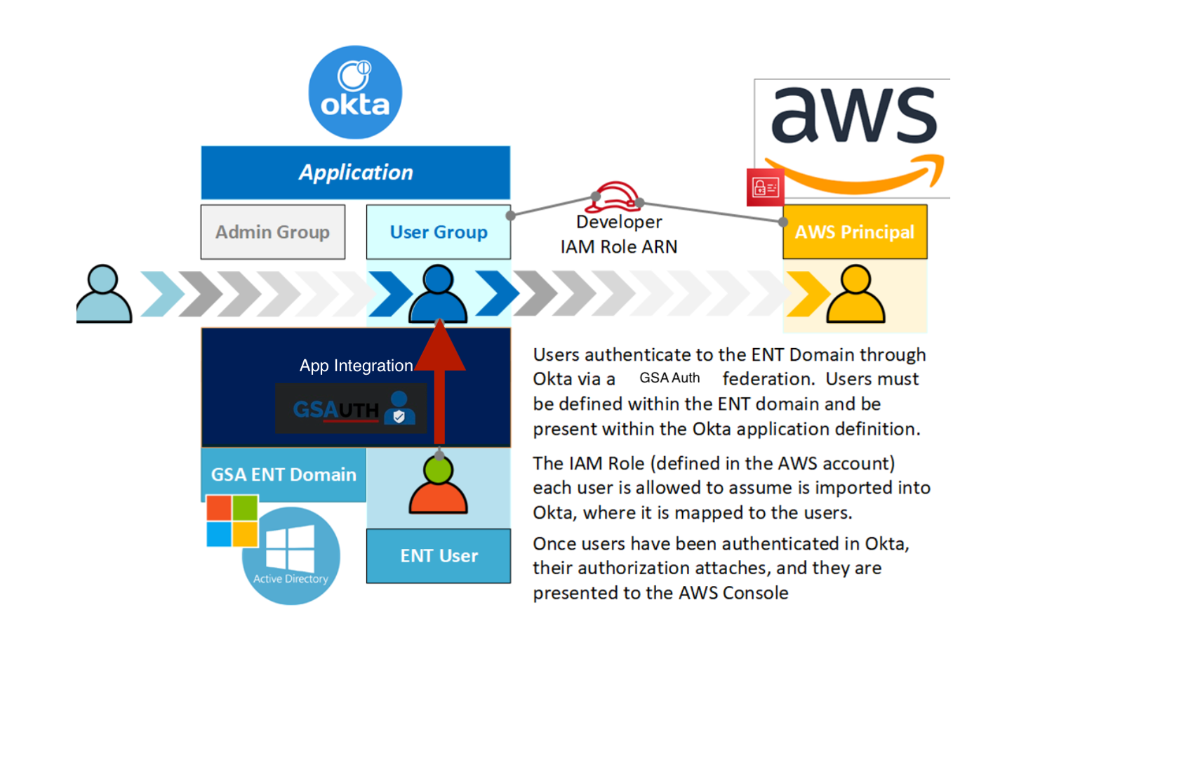 The implementation requires that each AWS account that developers (or any other kind of user) need to access be configured as a separate application within Okta. Developers authenticate to GSA's ENT domain through Okta, via a GSA-Auth integration.